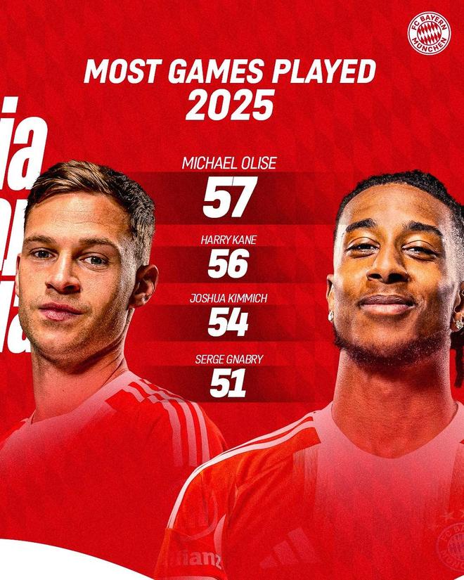 拜仁隊內2025年度參加比賽榜: